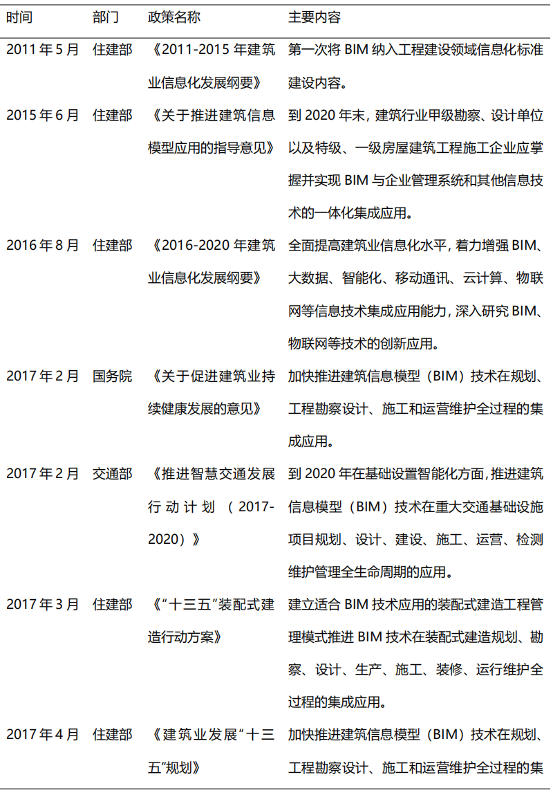 隨著社會(huì)的發(fā)展,行業(yè)需求的轉(zhuǎn)變,加之國家和各地政府的扶持,建筑行業(yè)信息化、數(shù)據(jù)化、智能化趨勢(shì)不可逆轉(zhuǎn)。BIM勢(shì)必全面應(yīng)用到規(guī)劃、勘察、設(shè)計(jì)、施工和運(yùn)營維護(hù)中來,實(shí)現(xiàn)工程建設(shè)項(xiàng)目全生命周期數(shù)據(jù)共享和信息化管理。近年來,國務(wù)院、住建部等相關(guān)單位,頻繁頒發(fā)鼓勵(lì)和要求應(yīng)用BIM技術(shù)的指導(dǎo)意見,表1列出了國家層面的重要文件。
