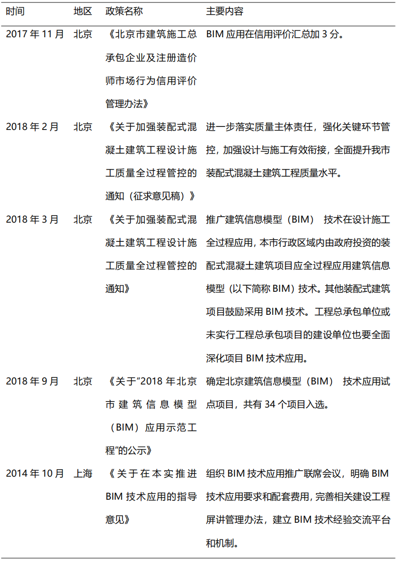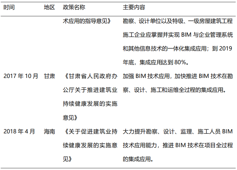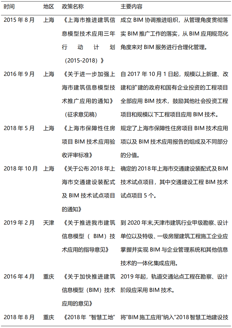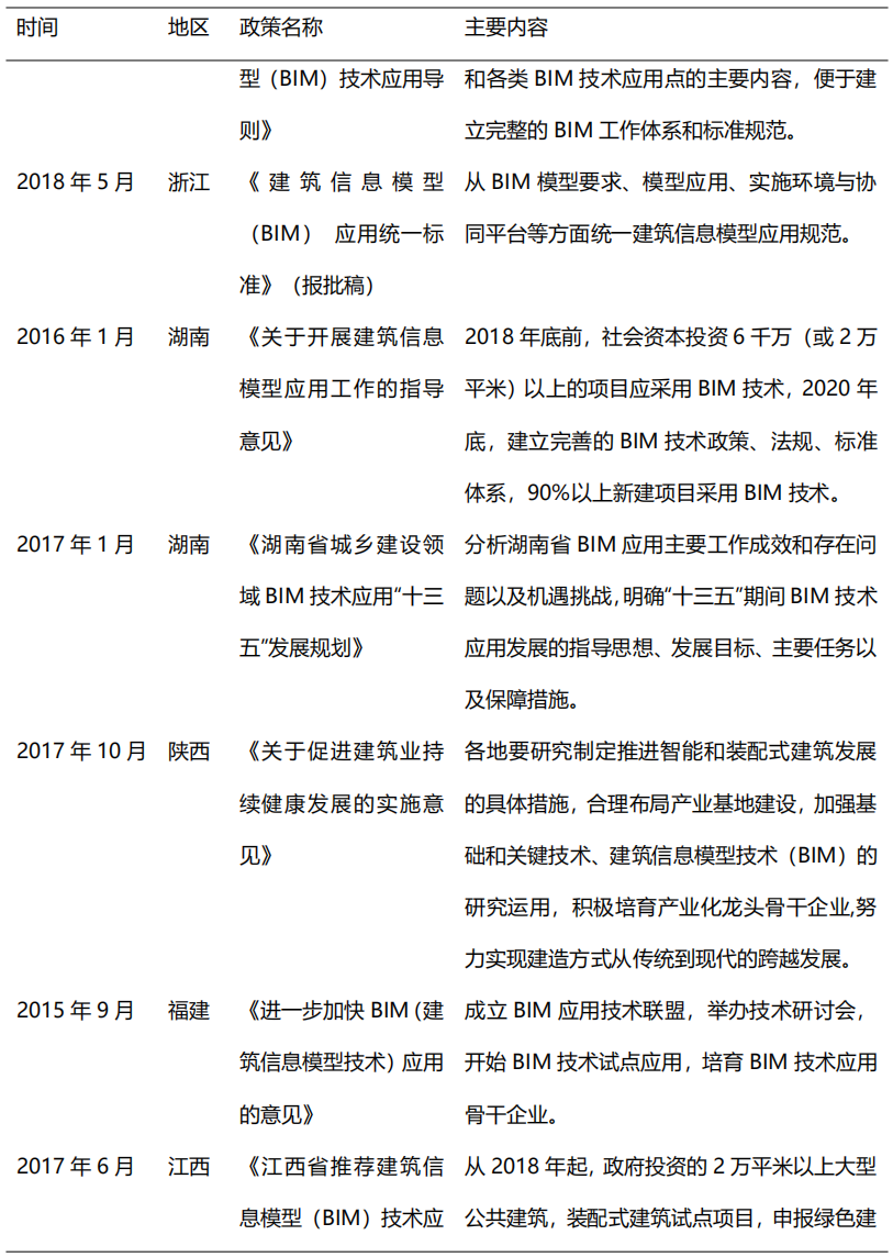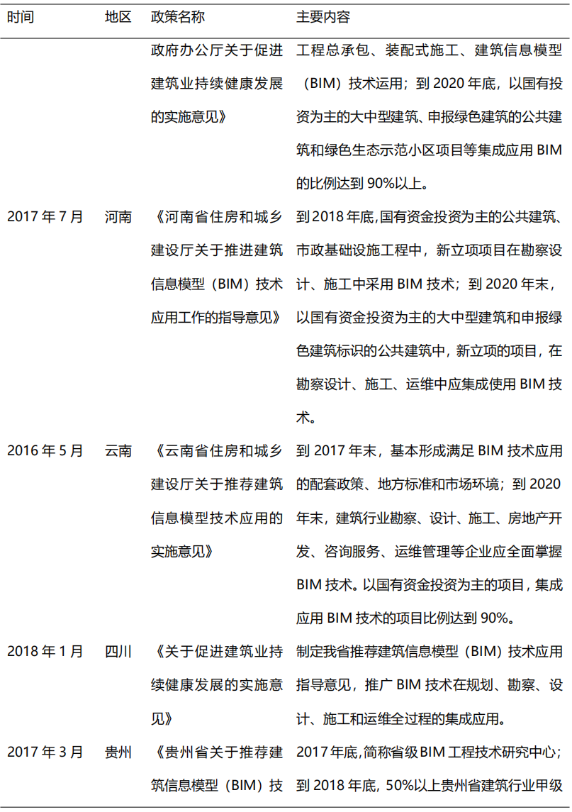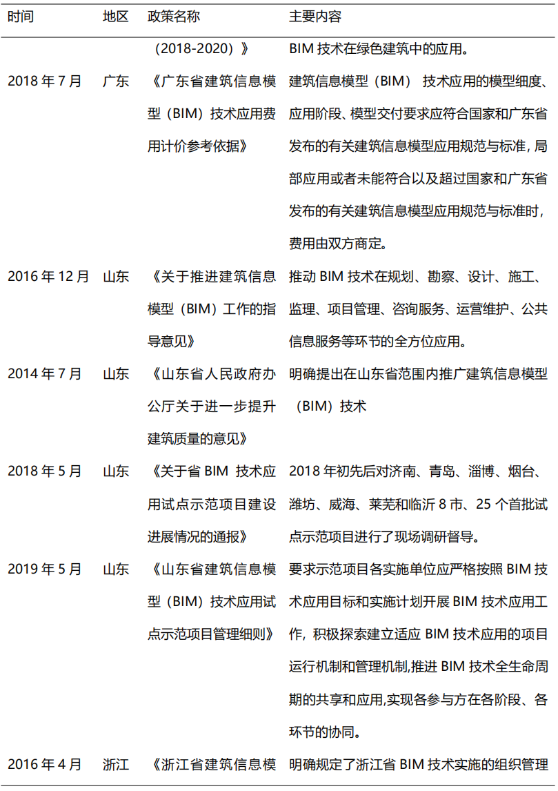 從2014年開始,在住建部的大力推動(dòng)下,各省市政策相繼出臺(tái)BIM推廣應(yīng)用文件,到目前我國已初步形成BIM技術(shù)應(yīng)用標(biāo)準(zhǔn)和政策體系,為BIM的快速發(fā)展奠定了堅(jiān)實(shí)的基礎(chǔ)。2017年,貴州、江西、河南等省市正式出臺(tái)BIM推廣意見,明確提出在省級(jí)范圍內(nèi)提出推廣BIM技術(shù)應(yīng)用。2018-2019年,各地政府對(duì)于BIM技術(shù)的重視程度不減,重慶、北京、吉林、深圳等多地政策出臺(tái)指導(dǎo)意見,旨在推動(dòng)BIM技術(shù)進(jìn)一步應(yīng)用普及。隨著我國出臺(tái)BIM推廣意見的省市數(shù)量逐漸增多,全國BIM技術(shù)應(yīng)用推廣的范圍更加廣泛。表2列舉了部分重要地方鼓勵(lì)政策。