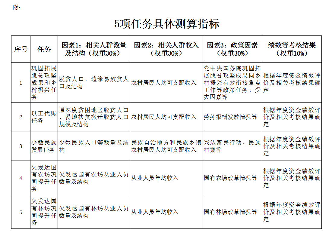 第二條 銜接資金按照鞏固拓展脫貧攻堅(jiān)成果和鄉(xiāng)村振興、以工代賑、少數(shù)民族發(fā)展、欠發(fā)達(dá)國(guó)有農(nóng)場(chǎng)鞏固提升、欠發(fā)達(dá)國(guó)有林場(chǎng)鞏固提升、“三西”農(nóng)業(yè)建設(shè)任務(wù)進(jìn)行分配。資金分配按照因素法進(jìn)行測(cè)算,因素和權(quán)重為:相關(guān)人群數(shù)量及結(jié)構(gòu)30%、相關(guān)人群收入30%、政策因素30%、績(jī)效等考核結(jié)果10%,并進(jìn)行綜合平衡。各項(xiàng)任務(wù)按照上述因素分別確定具體測(cè)算指標(biāo)(詳見附件)。“三西”農(nóng)業(yè)建設(shè)任務(wù)按照國(guó)務(wù)院批準(zhǔn)的規(guī)模安排。