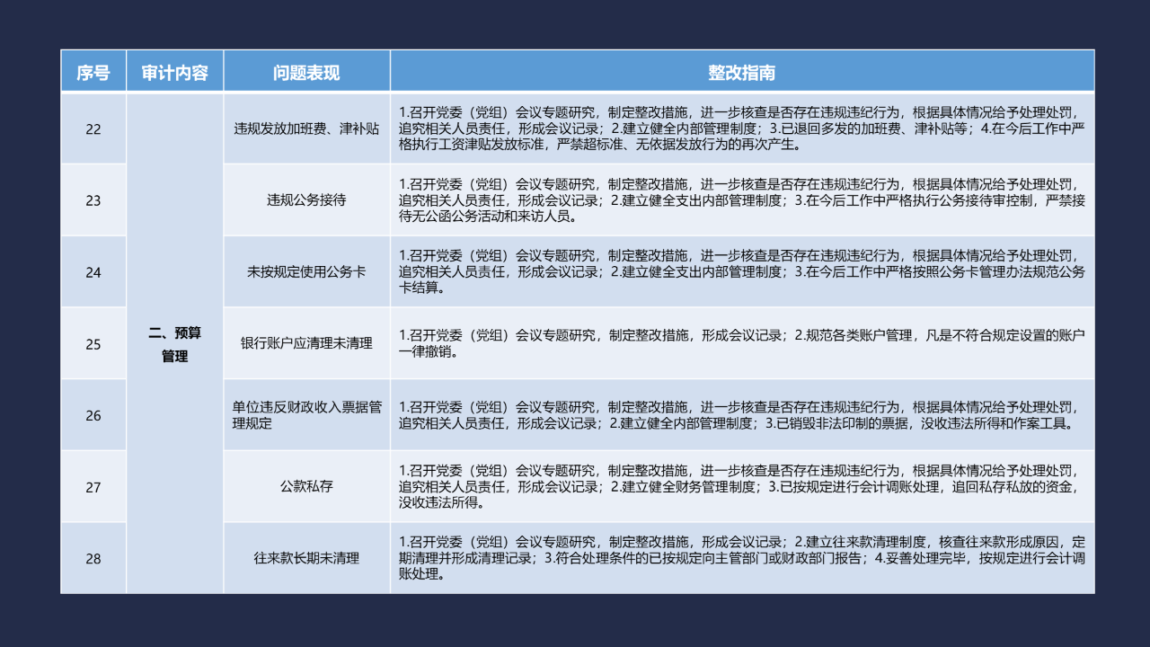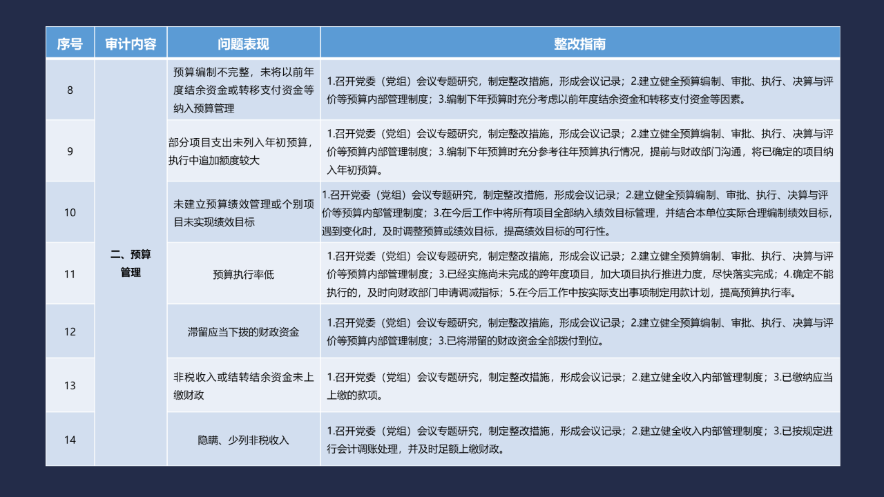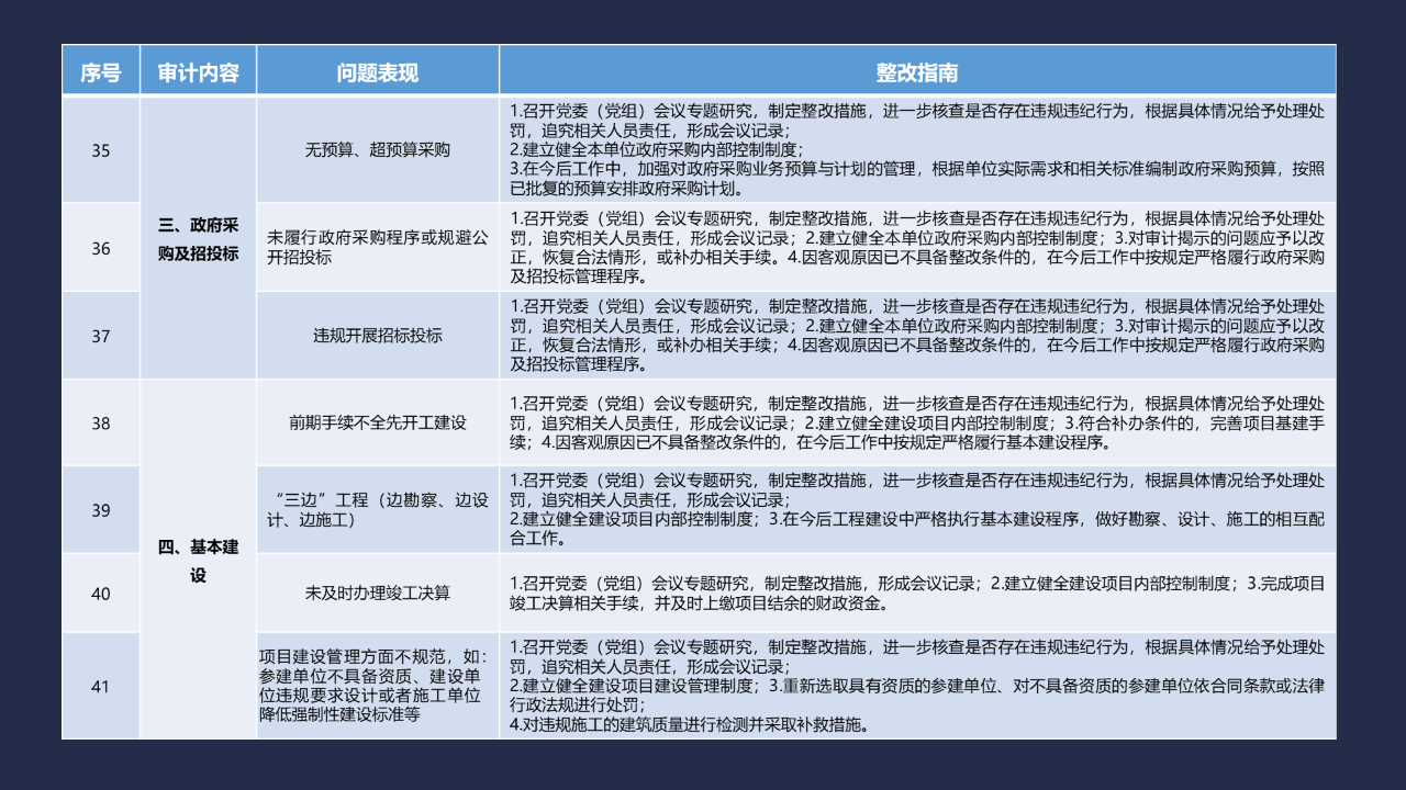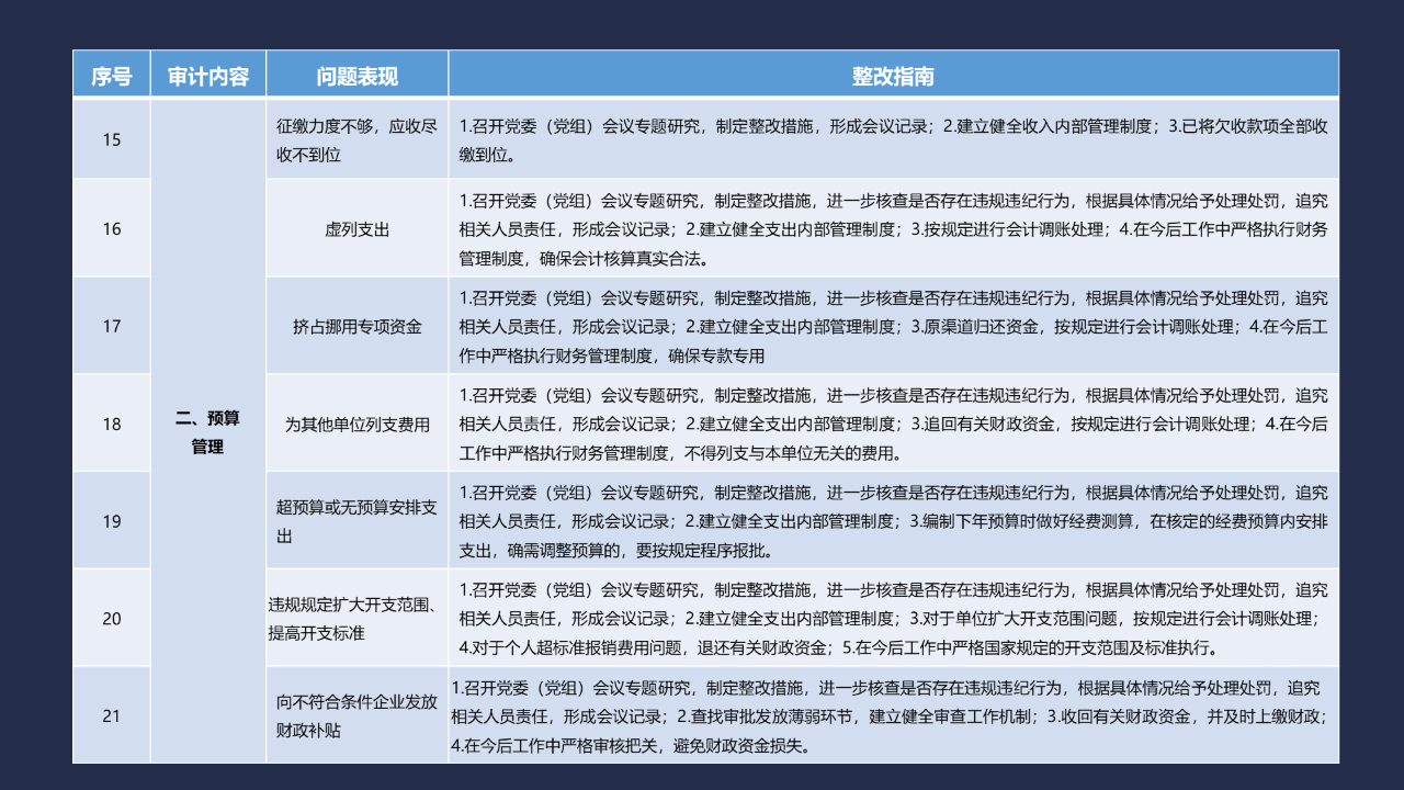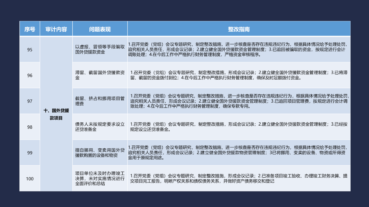 《整改指南100條》按照常見的重大政策措施落實、預(yù)算管理、政府采購及招投標(biāo)、基本建設(shè)、內(nèi)控管理、企業(yè)管理、自然資源、社保資金及安居工程、金融管理、國外貸援款共10類審計內(nèi)容進(jìn)行問題分類,列舉了100個常見問題并給出相對應(yīng)的整改方法說明,供審計機(jī)關(guān)和整改責(zé)任單位在審計整改工作中參照落實。