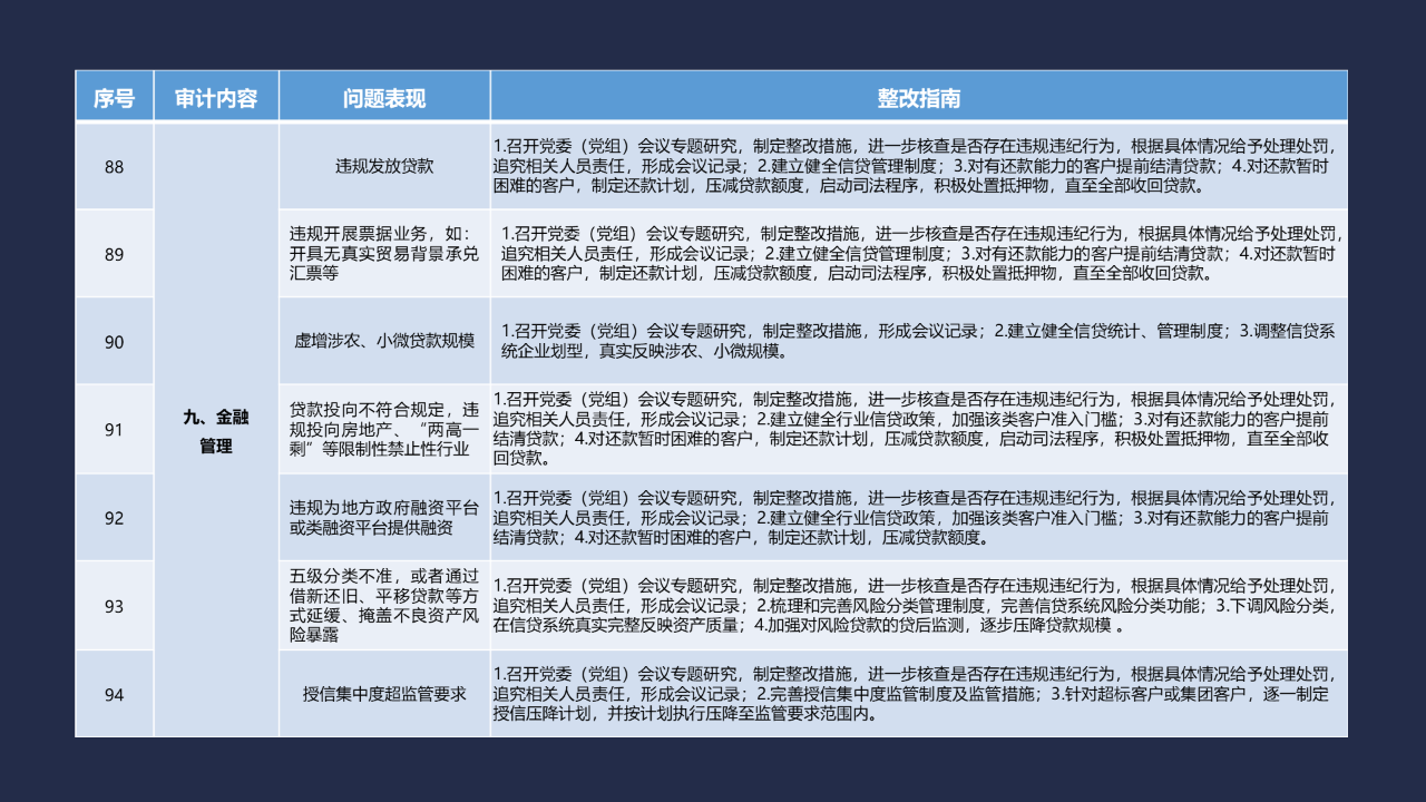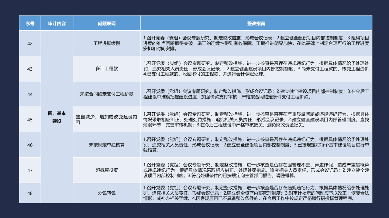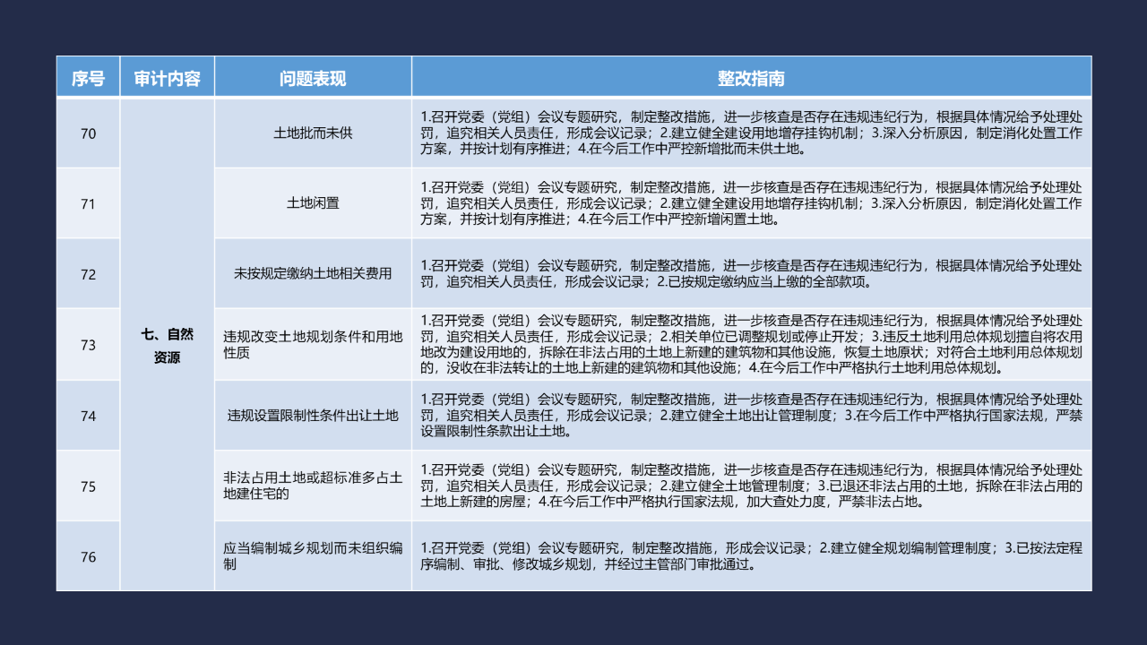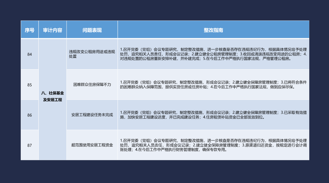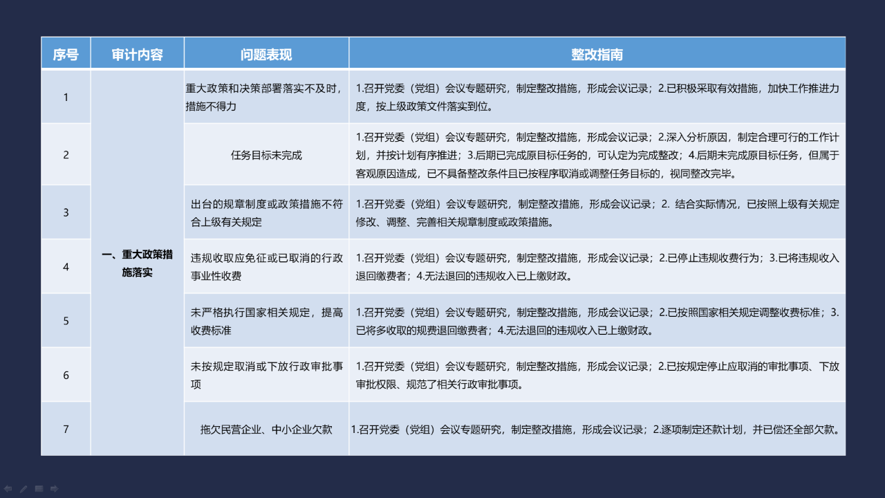 《整改指南100條》按照常見的重大政策措施落實、預(yù)算管理、政府采購及招投標(biāo)、基本建設(shè)、內(nèi)控管理、企業(yè)管理、自然資源、社保資金及安居工程、金融管理、國外貸援款共10類審計內(nèi)容進(jìn)行問題分類,列舉了100個常見問題并給出相對應(yīng)的整改方法說明,供審計機(jī)關(guān)和整改責(zé)任單位在審計整改工作中參照落實。