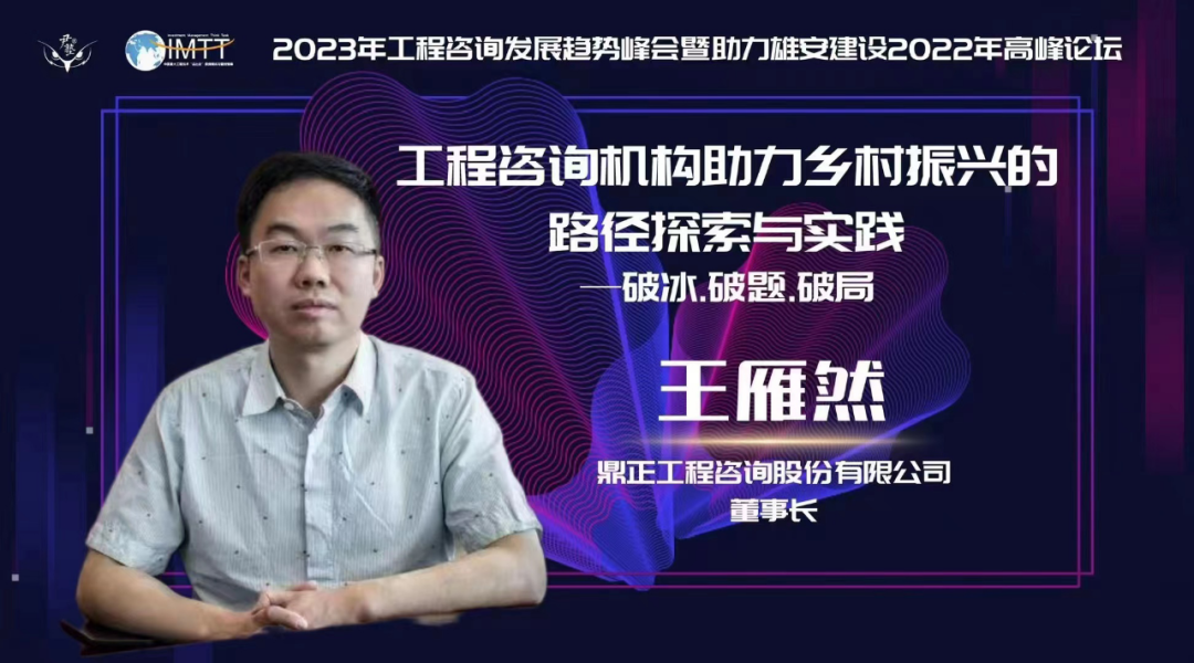 王雁然董事長受邀參與論壇并發表主題演講,他以《工程咨詢機構助力鄉村振興的路徑探索與實踐》為題,從破冰、破局、破題三個層次逐步切入,先后論述了新時代背景下推進鄉村振興戰略面臨的機遇與挑戰。