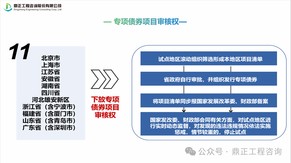 地方政府專項債券項目“自審自發”試點地區名單:北京市、上海市、江蘇省、浙江省(含寧波市)、安徽省、福建省(含廈門市)、山東省(含青島市)、湖南省、廣東省(含深圳市)、四川省、河北雄安新區等11個省市。