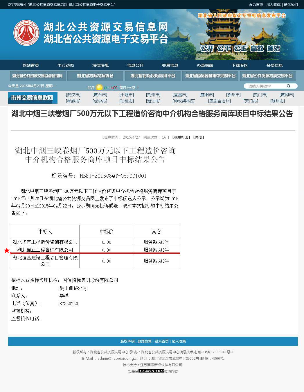 【經營成果】我司入選湖北中煙三峽卷煙廠500萬元以下工程造價咨詢中介機構合格服務商庫