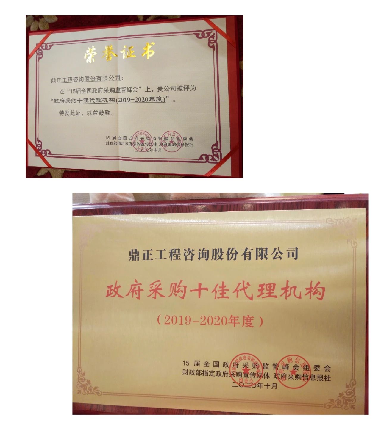 2020年10月,在由《政府采購信息》報聯合政府采購信息網舉辦主辦的“全國政府采購百強代理機構(2019-2020年度)暨全國政府采購十佳代理機構(2019-2020年度)”評選活動中,我公司榮獲“全國政府采購十佳代理機構(2019-2020年度)”稱號,是湖北省唯一榮獲此殊榮的公司。